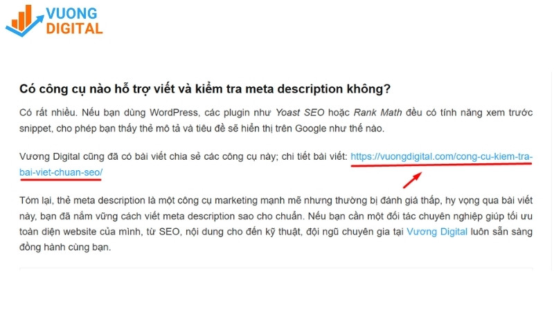 Tóm lại, văn bản neo là một thành phần nhỏ nhưng có sức ảnh hưởng cực lớn trong chiến lược SEO. Nếu bạn đang tìm kiếm một giải pháp SEO toàn diện và chuyên nghiệp để tối ưu từng chi tiết nhỏ nhất cho website của mình, đừng ngần ngại liên hệ với đội ngũ chuyên gia tại Vương Digital để được tư vấn ngay hôm nay.