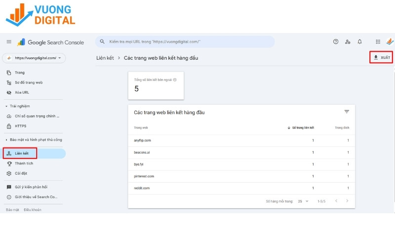 - Chọn “Xuất liên kết bên ngoài” (Export external links) để tải về danh sách backlink.
