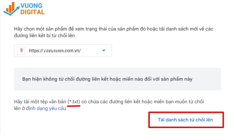 domain:vào trước (ví dụ:domain:spam-website.com). - Truy cập Google Disavow Tool: https://search.google.com/search-console/disavow-links