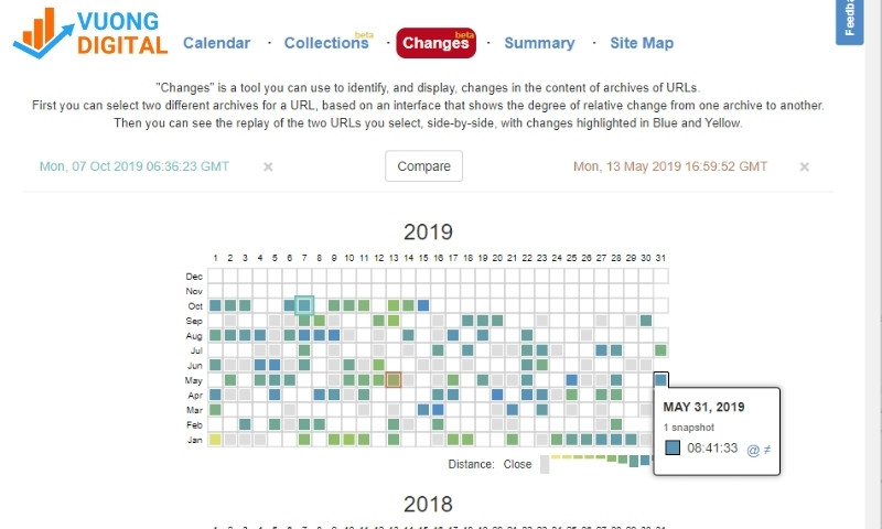 - Công cụ sẽ hiển thị một biểu đồ thời gian. Bạn có thể nhấp vào các năm và các ngày được đánh dấu để xem giao diện và nội dung của website tại thời điểm đó.