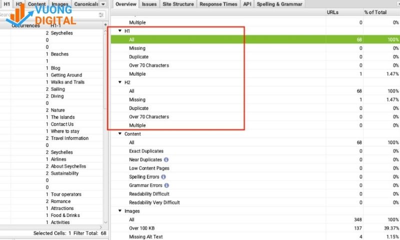 Sau khi quá trình crawl hoàn tất, bạn sẽ có một kho dữ liệu khổng lồ. Đừng lo lắng, hãy cùng Vương Digital khám phá từng tab quan trọng nhất.