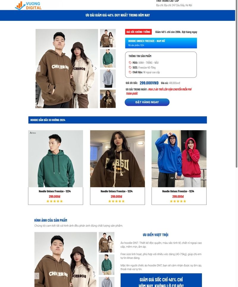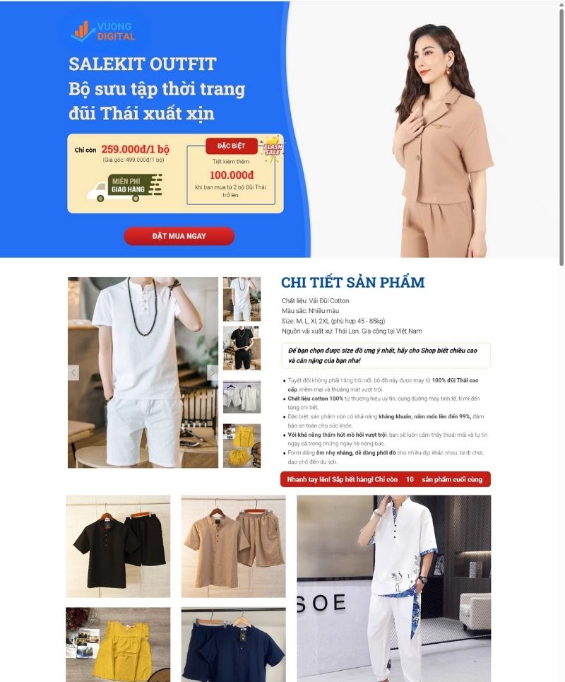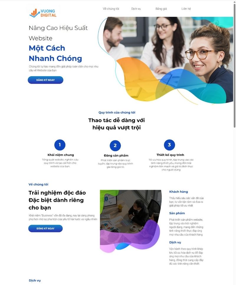 Với mẫu landing page do Vương Digital thiết kế, bạn sẽ có một giao diện sắc nét, hiện đại và tập trung 100% vào mục tiêu chuyển đổi: thu lead, bán hàng hoặc giới thiệu sản phẩm/dịch vụ. Mọi yếu tố — từ bố cục, màu sắc, headline, CTA đến hình ảnh — đều được xây dựng dựa trên hành vi người dùng và các nguyên tắc CRO giúp tăng tối đa lượng khách hàng để lại thông tin.