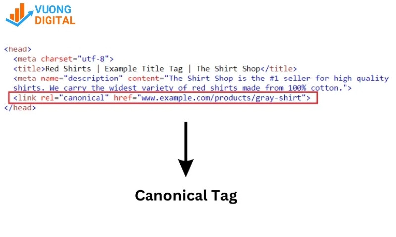https://www.vuongdigital.com) được chọn làm gốc cho tất cả các biến thể khác (http, không có www). - URL động: Các trang thương mại điện tử thường sử dụng tham số URL để lọc, sắp xếp sản phẩm. Ví dụ, URL của một danh mục áo sơ mi có thể có các biến thể để lọc theo màu sắc, kích thước. Tất cả các URL này nên có một thẻ canonical trỏ về URL danh mục chính.